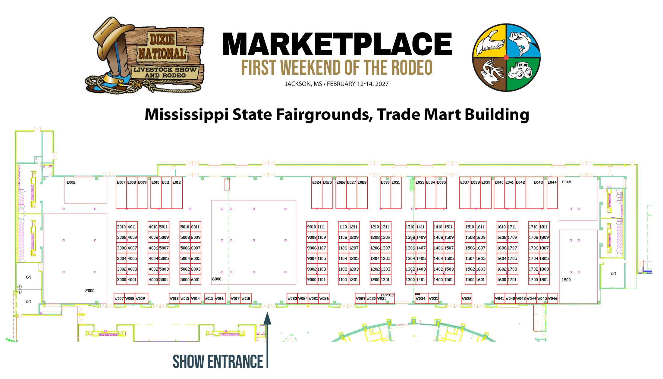 The Dixie National Marketplace will be held at the Mississippi State Fairgrounds, the first weekend of the rodeo. Located in the Trade Mart building, this building is 100% climate controlled, featuring 60,000 square feet of unobstructed space.